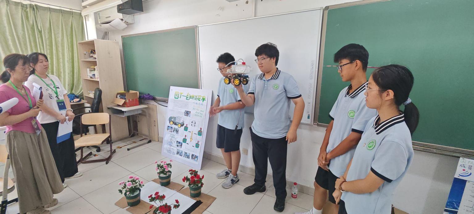 北京工业大学实验学校的学生们向裁判展示自动浇花车机器人的设计思路