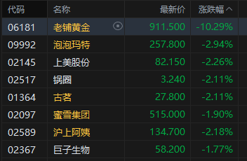 7月11日消息,港股新消费概念股逆势下跌期配宝,其中,老铺黄金跌超10%,泡泡玛特、古茗、沪上阿姨跌超2%。