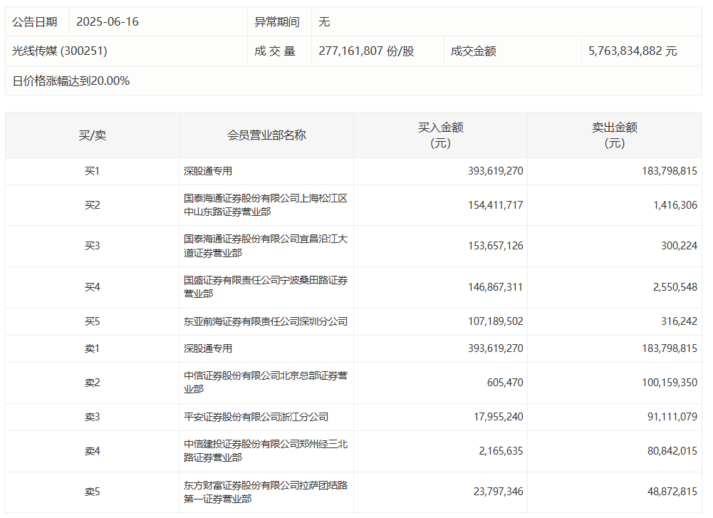 光线传媒今日涨停 深股通专用席位买入3.94亿元并卖出1.84亿元创赢盘光线传媒今日涨停 深股通专用席位买入3.94亿元并卖出1.84亿元